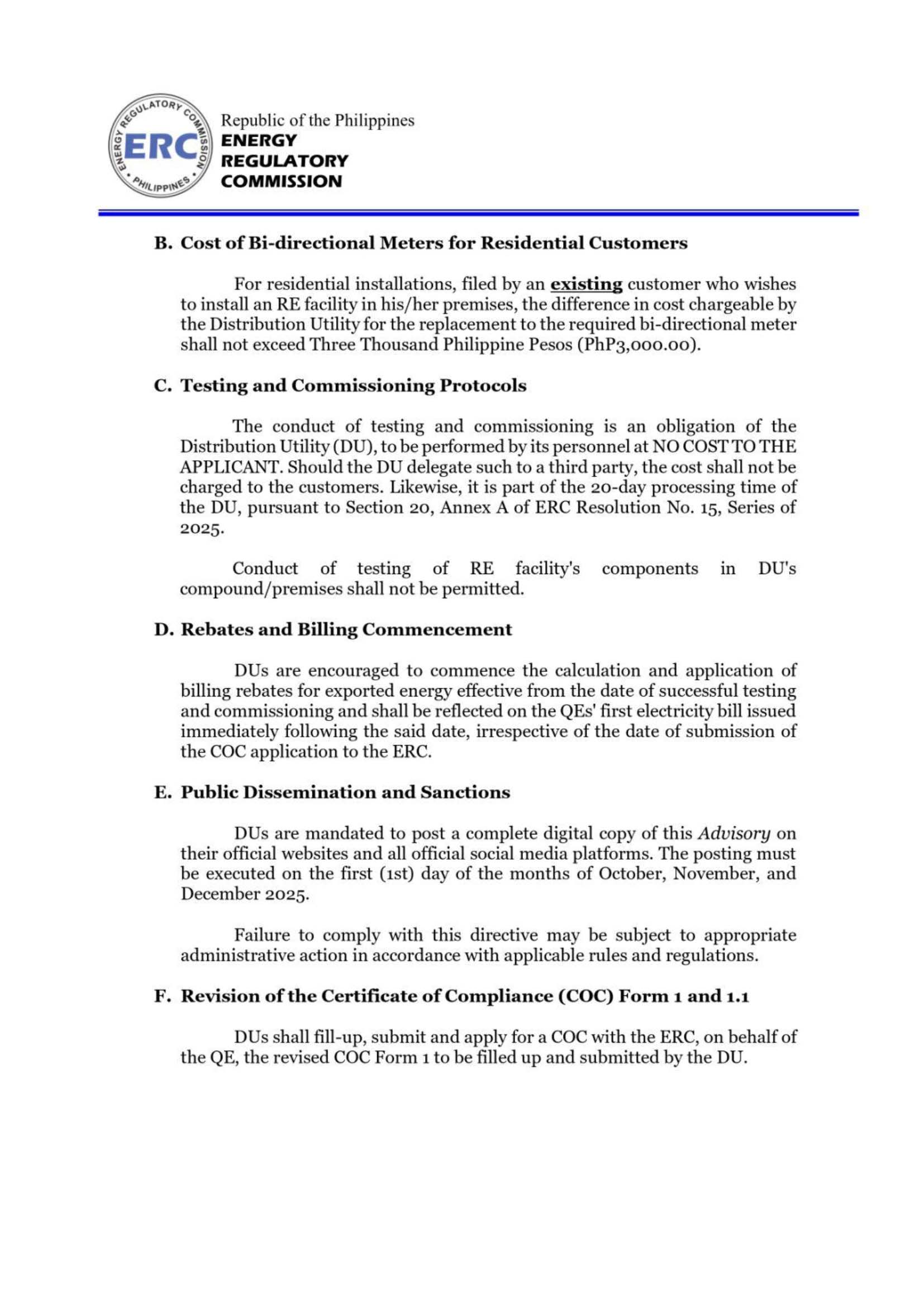 ADVISORY TO ON-GRID DISTRIBUTION UTILITIES IN COMPLIANCE WITH THE NET-METERING PROGRAM